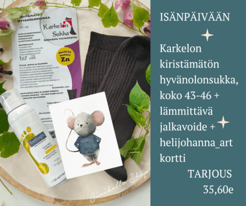 ALE!Pieni erä Isänpäivään 9.11.-25! Paketti sisältää: Karkelon mustat kiristämättömät hyvänolonsukat, koko 43-45 + lämmittävän jalkavoiteen ja helijohanna_artin ihastuttavan postikortin.